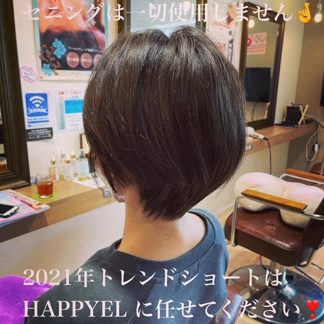HAPPYELのカット 1.女性カットのスキばさみを使わず髪の傷みをなくすカット 2.指通りがよく自分でも楽にスタイリングができる 3.柔らかな束感を出す 4.理想の骨格を作る 5.90日間持続可能 6.必ず違いが実感できます。